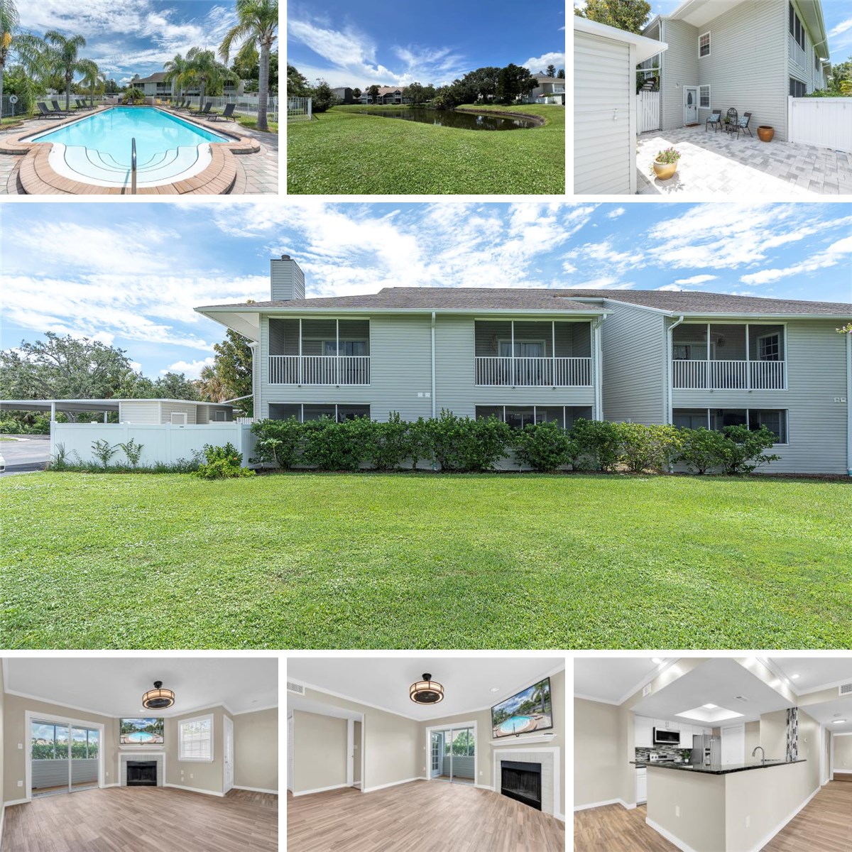 Welcome to Savannah Trace, your single-story maintenance free living at its finest. Sitting in a PRIME LOCATION, close to the Tampa Bay area beaches & extremely convenient to the Tampa International Airport. This 3 Bedroom, 2 Bath, corner unit home comes with 2 assigned parking spaces, one being a covered carport. This home has been newly updated and move in ready. Welcome inside your private courtyard, fenced for lots of privacy and makes a great place to sip your morning coffee, lots of room to entertain or to just relax and unwind. Expect to be wowed as you step inside, it's freshly painted with a beautiful neutral color and features wood look tile throughout the main living areas, new carpet in the bedrooms & crown molding in every room. The open living room is inviting with a cozy, wood-burning fireplace and sliding doors that lead to a private screened lanai. This is just one of the three patios you'll have to enjoy! The open concept flows nicely into the adjoining kitchen & dining area. This kitchen is a beauty, with stainless steel appliances, coordinating backsplash, Granite countertops, breakfast bar & a French door refrigerator. Your primary bedroom is spacious with a walk-in closet and ensuite bathroom that has an updated walk-in shower and grand-style vanity with LED mirror. The 2nd & 3rd bedrooms are equally impressive, both with access to their own screened lanai's. The guest bathroom has that wow factor with a beautifully tiled walk-in shower and luxury style vanity with LED lighted mirror! You'll find ceiling fans throughout, inside laundry with full size washer & dryer included and a private storage closet on the patio. Three private patios is such a rare find, this single-story end unit condo really does have it all! The community swimming pool is just steps away, making it easy to take a dip in the pool on these hot summer days. Savannah Trace has beautifully maintained grounds with lush landscaping and serene, peaceful ponds to enjoy. This is the one you've been waiting for, give me a call to schedule your private showing today.